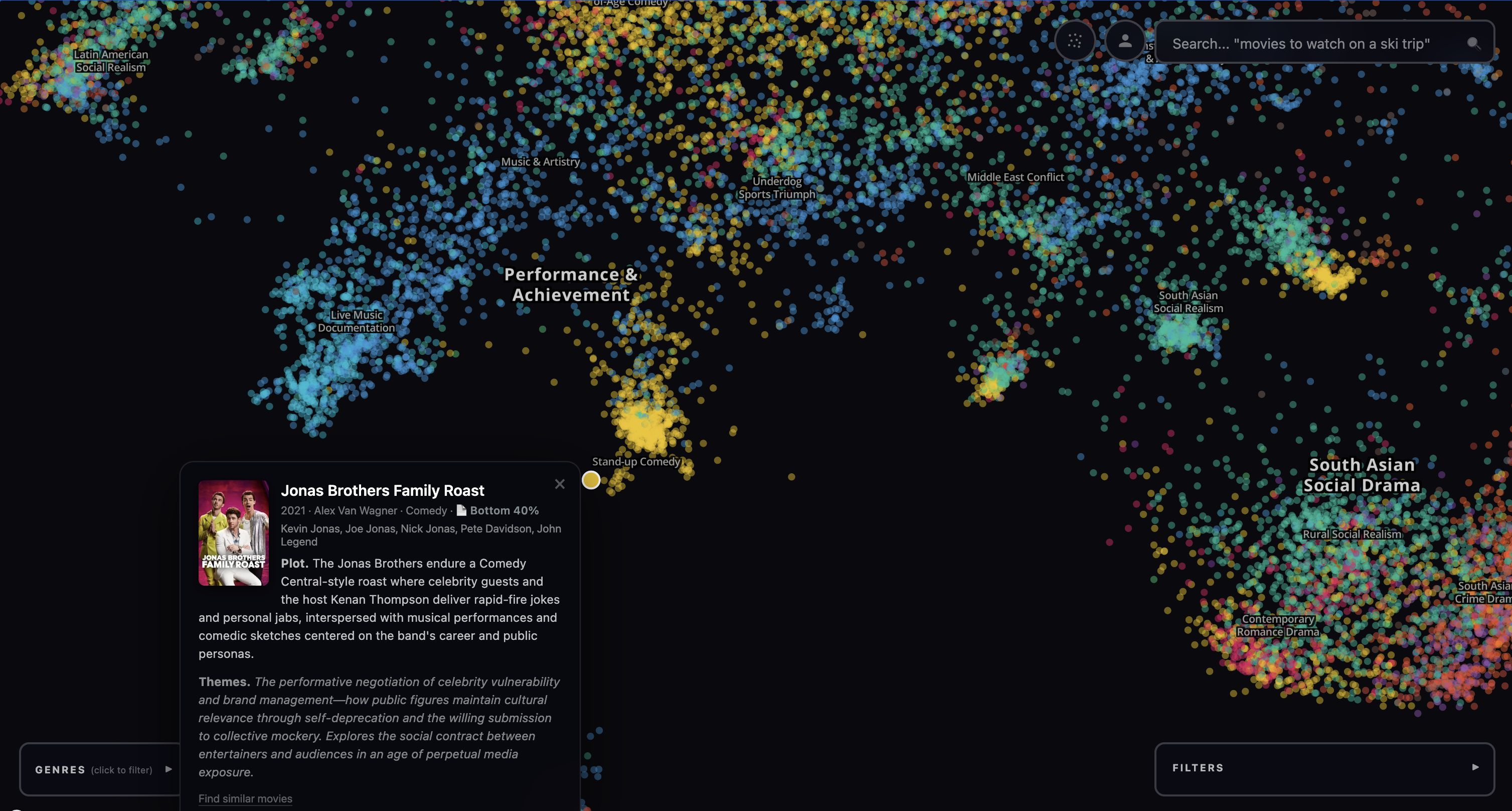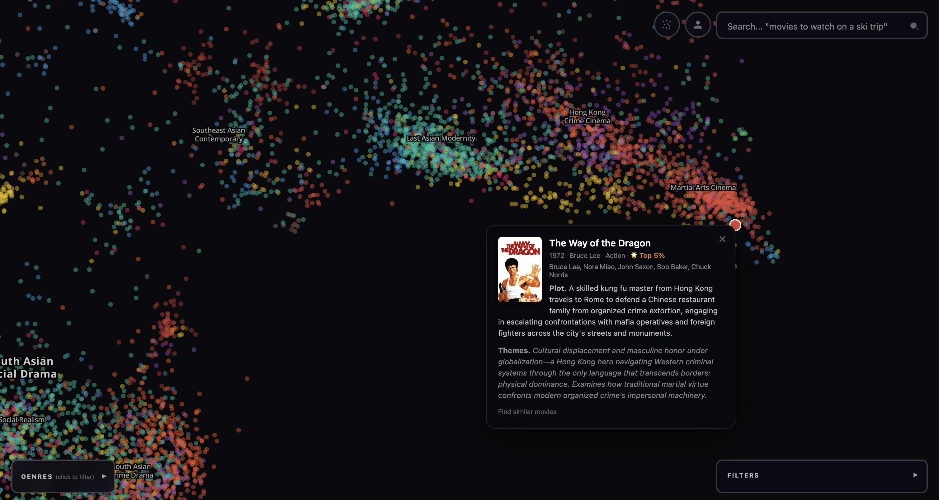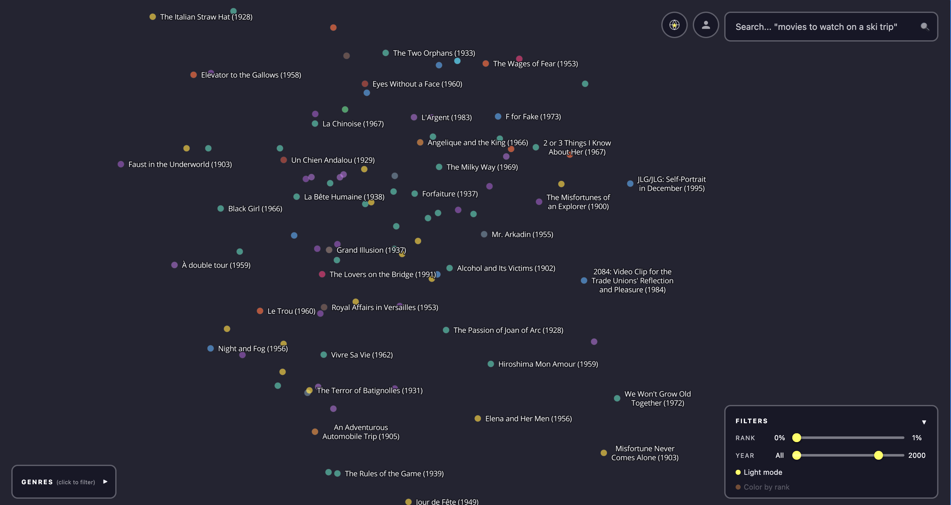Final result. The final result is Google Maps for all movies. It is a dark map full of dots, each corresponding to a different movie. The dots are colored by genre and filterable by IMDB rating, year made, and popularity (top 10%, 50%, etc). The user can also search the corpus of movies with a search bar, and when this happens the dots are all made partially transparent except for the top 200 results, which are rendered with a glow effect. The result looks like a milky way with different densities and brightnesses of stars and is quite beautiful to pan over and explore.