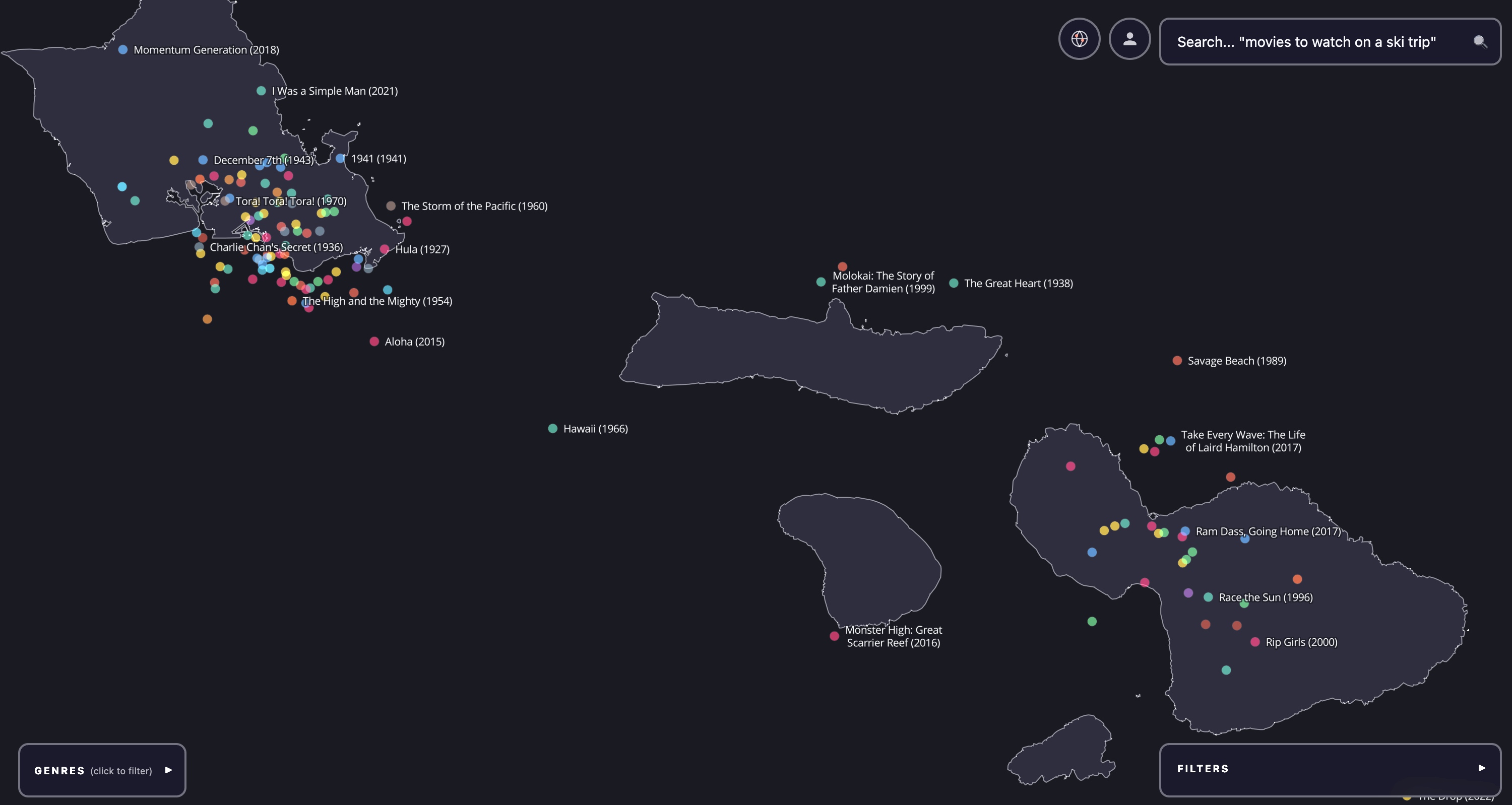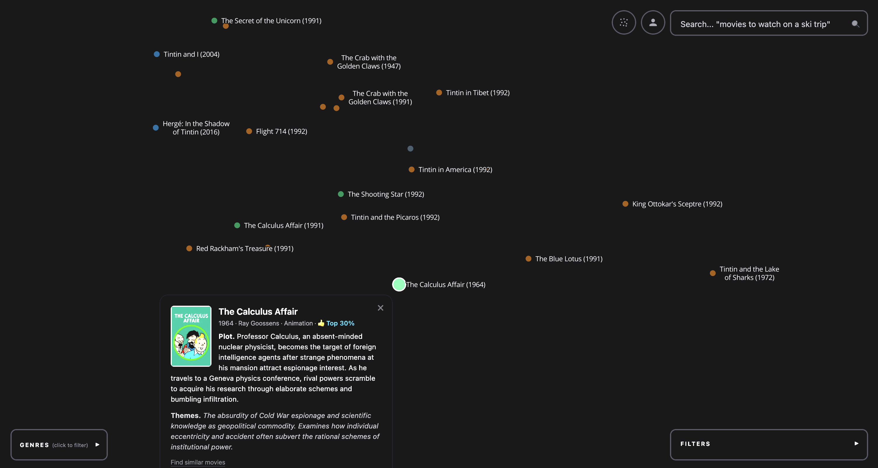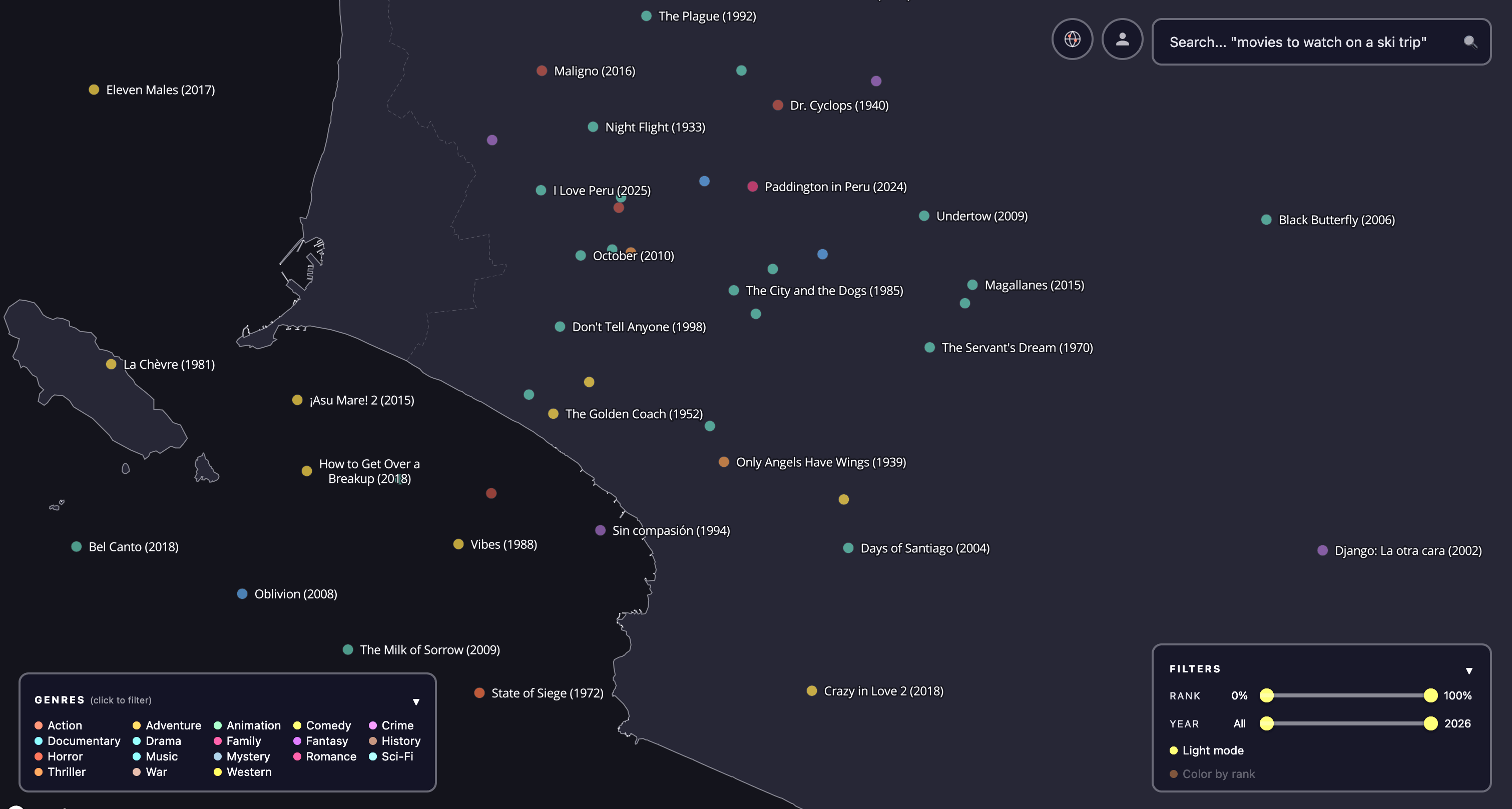 Final result. The final result is Google Maps for all movies. It is a dark map full of dots, each corresponding to a different movie. The dots are colored by genre and filterable by IMDB rating, year made, and popularity (top 10%, 50%, etc). The user can also search the corpus of movies with a search bar, and when this happens the dots are all made partially transparent except for the top 200 results, which are rendered with a glow effect. The result looks like a milky way with different densities and brightnesses of stars and is quite beautiful to pan over and explore.