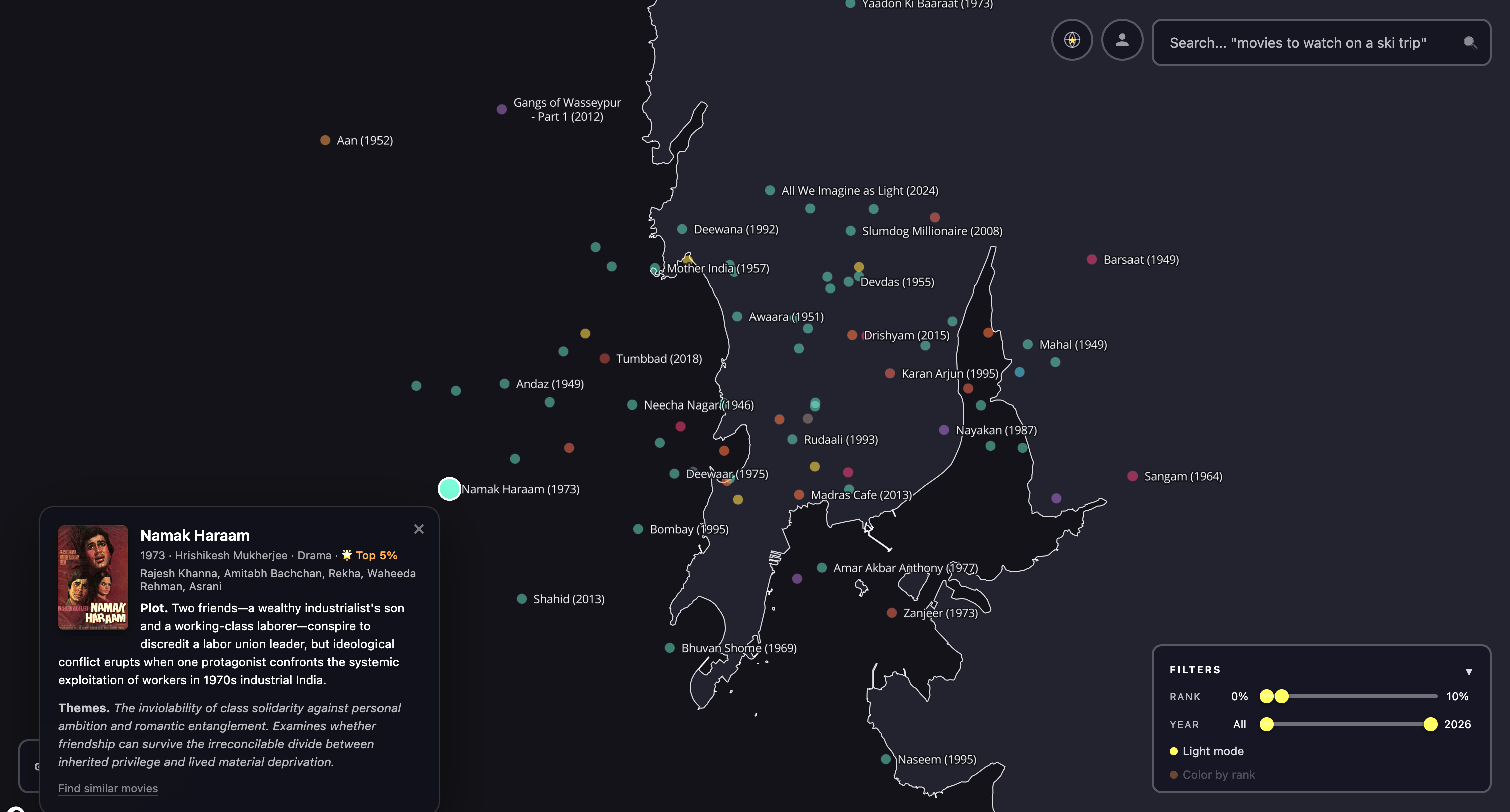 It’s important to note that this map is showing you something different from “people who liked movie X also like the set of movies {Y}”, which is what many recommender systems do. Rather, it shows “the themes, mood, and ideas of movie X are shared by the set of neighbors {Y}”. This is a different and more first-principles way for a curious person to discover new films.